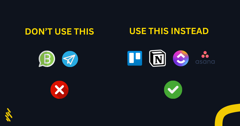 هناك العديد من البدائل ، والتي تعتبر أفضل بكثير من الواتساب لسهولة استخدامها وسهولة الوصول إليها ، وليس هناك احتمال فقدان بياناتك فيها ، توجد تطبيقات مجانية تستطيع من خلالها أن تبني نظاما تضع فيه جميع بياناتك ، من كلمات المرور، الرسائل والايميلات الجاهزة ،بيانات العملاء ،معلومات الموظفين، الملفات، عروض السعر,، الفاتورات ، تتبع المشاريع الخ … لقد تحدثت عن هذا الموضوع بتفصيل في مقالة العقل الثاني second brain